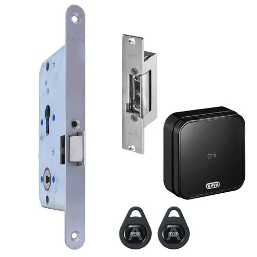 Mauer-jnf-evva Comfort loopslot din rechts met elektrische sluitplaat en Airkey wandlezer opbouw met 2 sleuteltags