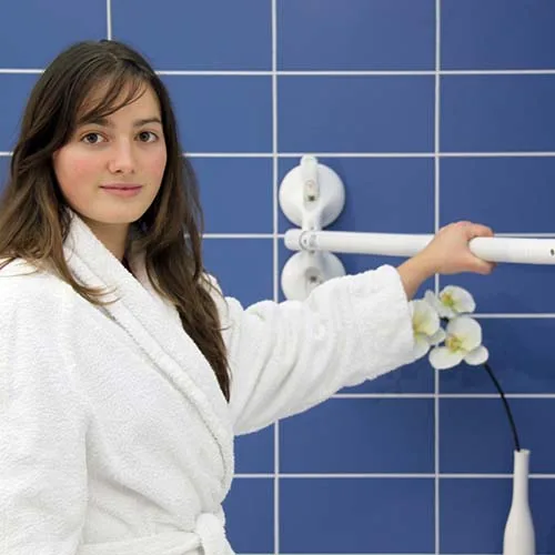 in alle richtingen worden bevestigd. Bijvoorbeeld diagonaal over het bad als hulpmiddel voor het in- en uitstappen.